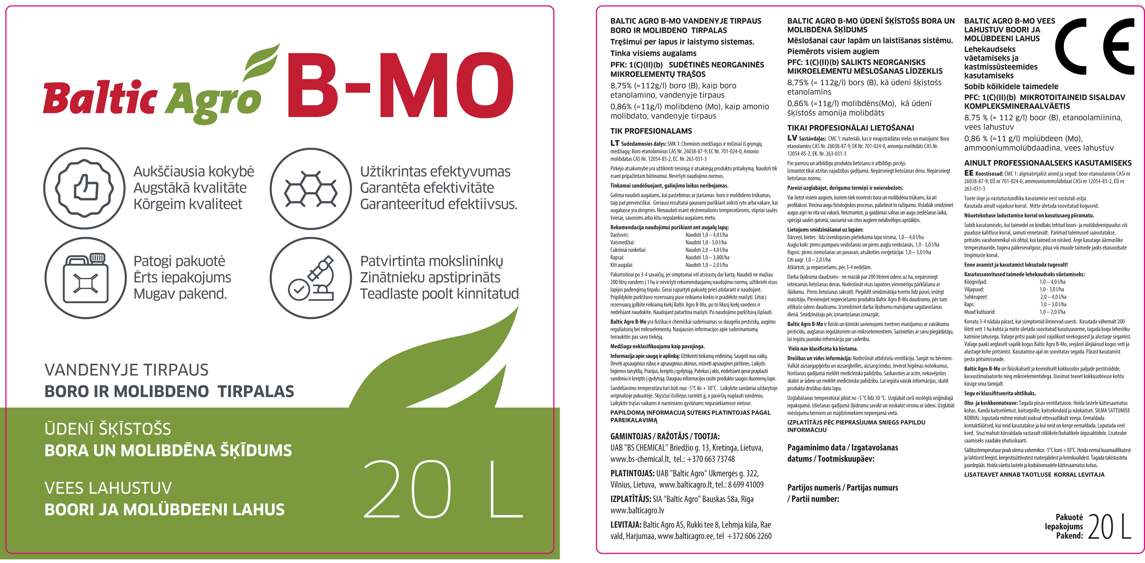Baltic Agro B-Mo on vees lahustuv boori ja molübdeeni lahus, mis sobib lehtede kaudu pritsimiseks ja kastmissüsteemides kasutamiseks kõikidel taimedel.
