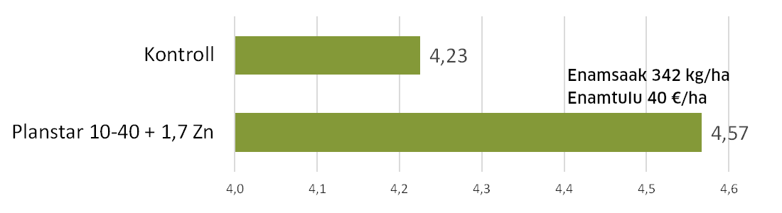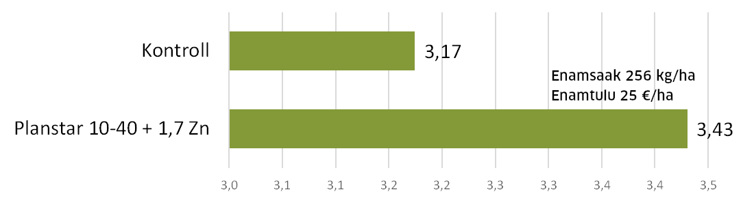 Starterväetist anti koos külviga 15 kg/ha ja starterväetist saanud variant andis kontrolliga võrreldes 256 kg/ha enamsaaki ning 25 €/ha enamtulu. (Tulukuse arvutamisel on võetud aluseks söödanisu hind 180,47 €/t.) Nisu langes söödaklassi langemisarvu tõttu.