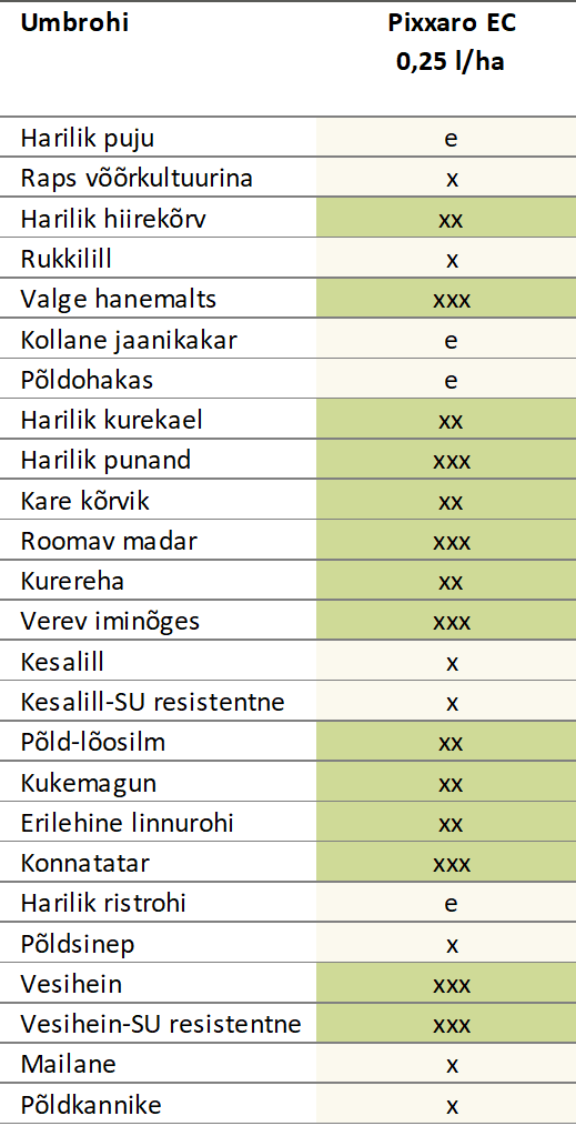 Kui põllul esineb ka põldkannikest, põldmailast, rukkilille, kesalille, põld-sinepit või rapsivarist (ei kehti Clearfield rapsi varise kohta), siis lisada Pixxaro EC-le preparaati Trimmer 50 SG. Kulunormid võiksid olla vastavalt 0,3 l/ha ja 15 g/ha.
