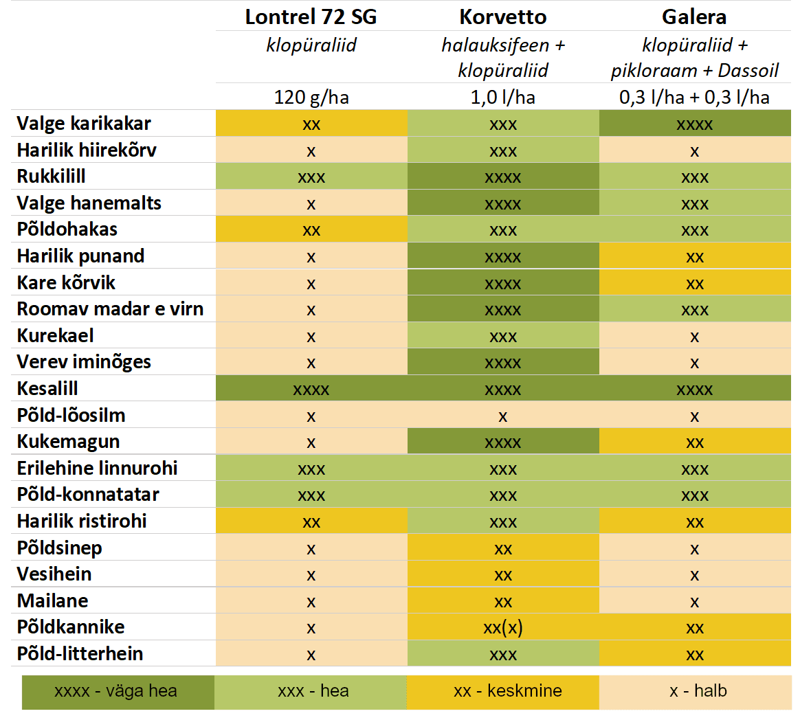 Tõrjub tõhusalt: valge hanemalts, roomav madar, harilik hiirekõrv, harilik kesalill, valge karikakar, kukemagun, vesihein, rukkilill, harilik punand, põldrõigas, põld-litterhein, kare kõrvik, põldohakas, põldsinep, harilik nälghein, hiireherned, harilik kassitapp, kibe piimalill, põld-piimohakas, harilik põisrohi, raps, põldmailane, pärsia mailane, kirburohud.