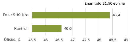 Õlisisalduse suurendamiseks soovitame pritsida taimikut NS väetisega, kui õitsvaid taimi on alles jäänud kuni 10%. Folur S kasutamine katses tõi 1,8% kõrgema õlisisalduse ja 21,5 eurot enamtulu hektarilt.