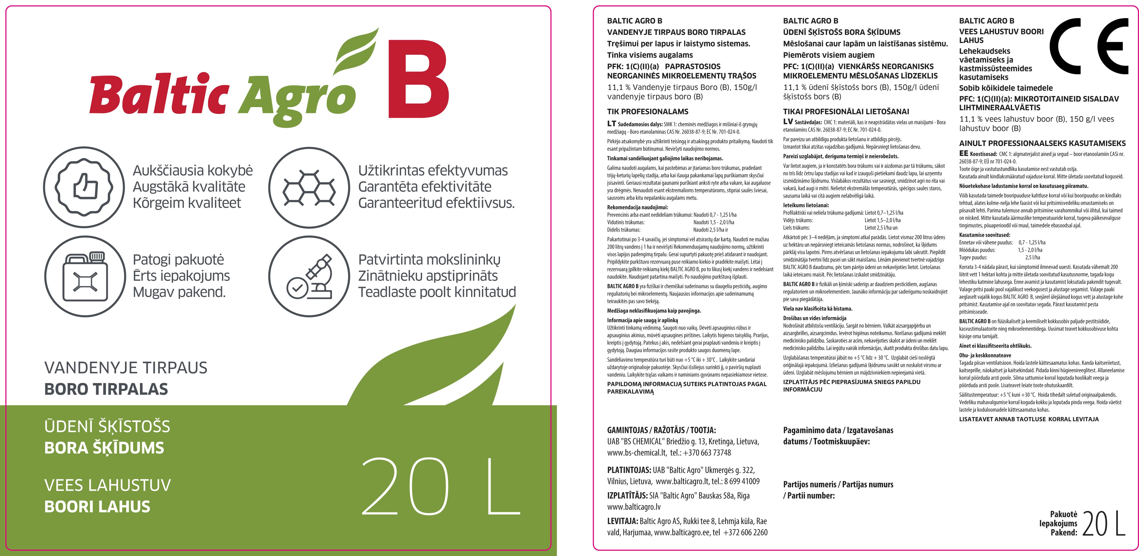 Baltic Agro B on vees lahustuv boori lahus, mis sobib lehtede kaudu pritsimiseks ja kastmissüsteemides kasutamiseks kõikidel kultuuridel.