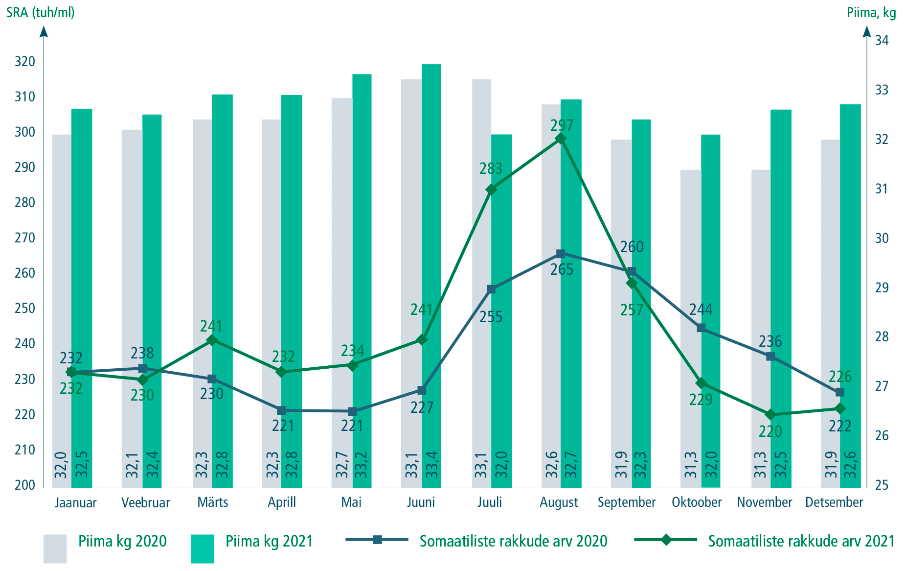 Kontrollpäeva piimatoodang ja somaatiliste rakkude arv, tuh/ml (Eesti Jõudluskontrolli Aastaraamat, 2021)