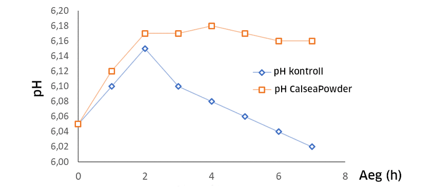 Sooda toime vatsas langeb tugevalt peale kahte tundi. CALSEAPOWDER seevastu saavutab selleks ajaks oma maksimaalse puhverdusvõime, mis kestab kuni 6 tundi.