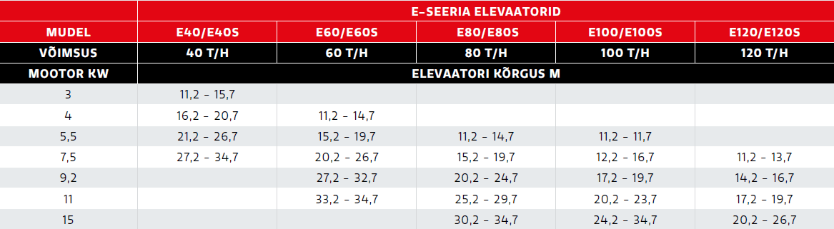 Tugevate elevaatorite E-seerias on viis võimsusvarianti. Jaotusseadmed, hooldusplatvormid ja redelid on saadaval vastavalt vajadusele.