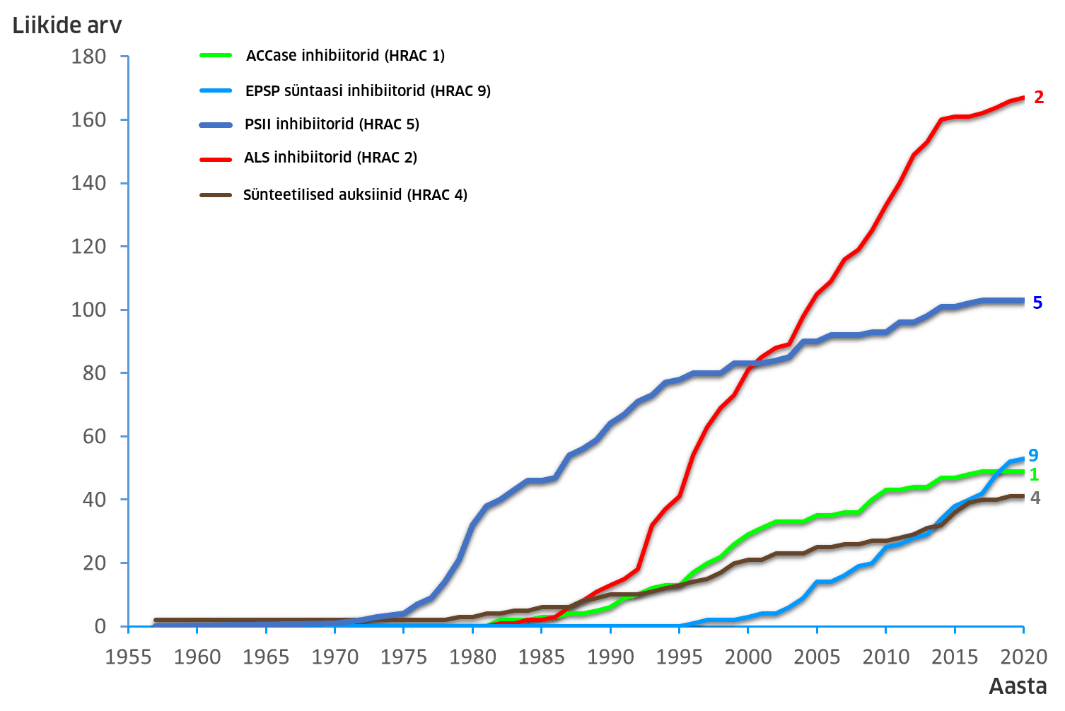 Alloleval joonisel on näha, et maailmas on tekkinud enim ALS (HRAC 2) herbitsiidide suhtes resistentseid umbrohuliike. ALS herbitsiidid on laialdaselt kasutusel ka Eestis. Teisel kohal on HRAC 5. gruppi kuuluvad fotosünteesi inhibiitorid, mis Eestis väga levinud pole. Sellele järgnevad HRAC 9 (glüfosaat), HRAC 1 (kõrreliste umbrohtude tõrjevahendid) ning sünteetilised auksiinid.
