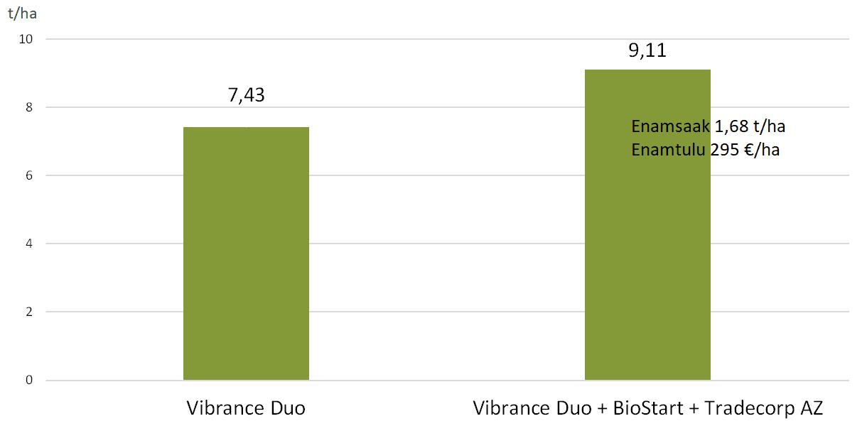 Kuusiku katsekeskuses korraldatai 2018. aastal talinisuga Skagen katse, kus kontrollvarianti (puhitud Vibrance Duo'ga 2 l/t) võrreldi variandiga Vibrance Duo 2 l/t + BioStart 1 l/t + Tradecorp AZ 150 g/t. Lisaainetega puhitud seeme tõi enasmaaki 1,68 t ja enamtulu 295 €/ha.