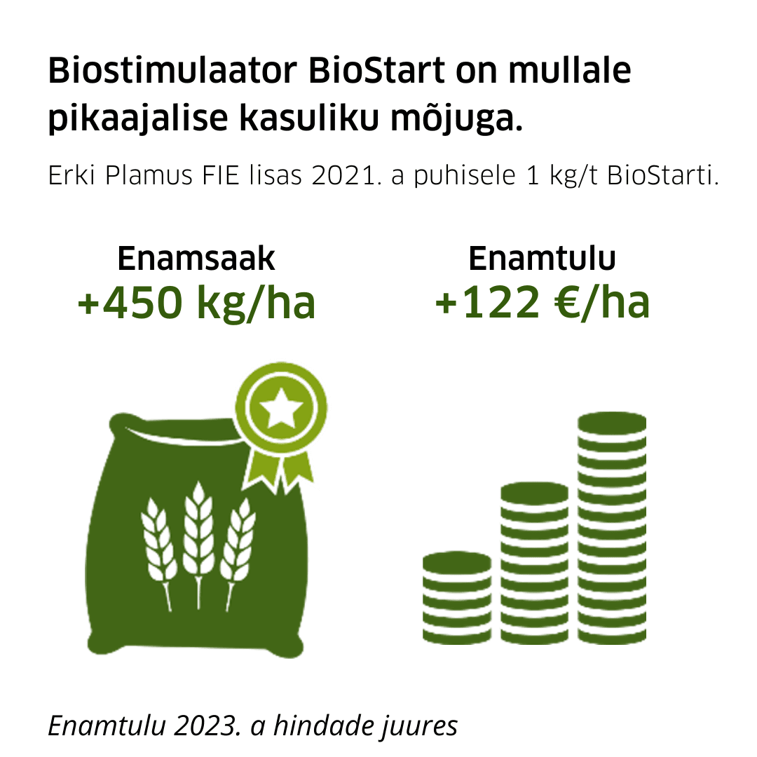 BioStart sisaldab looduslikult mullas esinevaid kasulikke mikroorganisme ja on mullale pikaajalise mõjuga. Kasulikud mikroorganismid tegutsevad seemne ja hiljem taime juure ümber kogu vegetatsiooniperioodi vältel, soodustades idanemist, juurdumist ning hilisemat arengut.