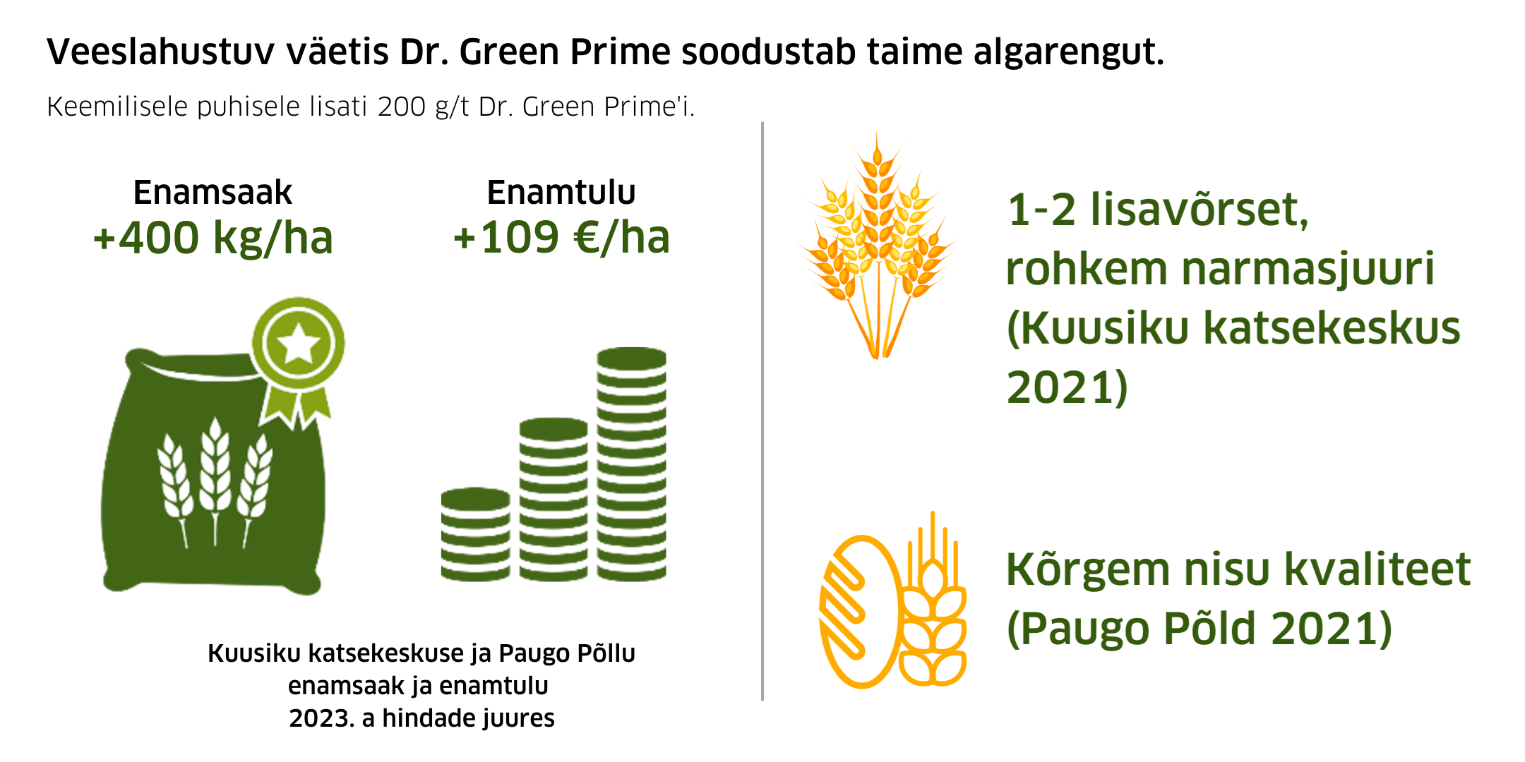 Katsed lisaainetega on andnud positiivseid tulemusi. Üheks selliseks tooteks on Dr Green Prime, mis on vees lahustuv väetis fosfori, kaaliumi, magneesiumi, boori, raua, mangaani, molübdeeni ja tsingiga. Toiteelementidele lisaks on toote koostises nn MicroActive kompleks (aminohapped + vitamiinid B1, C), mis aitab kaasa toiteelementide tõhusale omastamisele. Dr Green Prime on näidanud häid tulemusi nii katsekeskuses kui ka tootmispõllul.