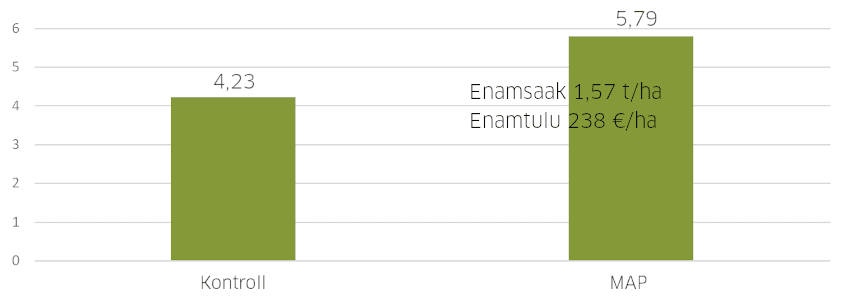 MAP väetist saanud taimede juurestik oli tihedam ja pikem, see aitas taimedel kasvuaegse põuaperioodi paremini üle elada. Seda kinnitasid ka saaginäitajad: külviga antud MAP tõi 1,57 t/ha enamsaaki ja 238 €/ha enamtulu. (Tulukuse arvutamisel on aluseks võetud söödanisu hind 180,47 €/t.)