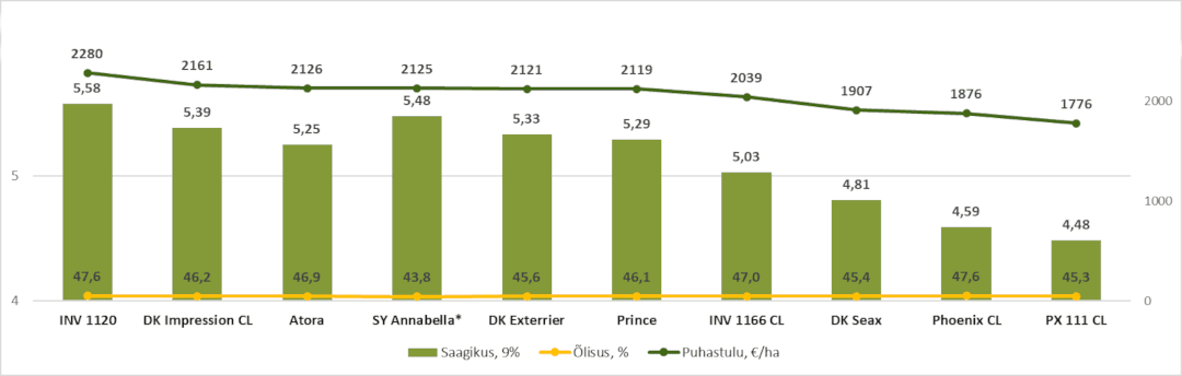 | Sort | Saagikus, 9% | Õlisus, % | Puhastulu, €/ha |
